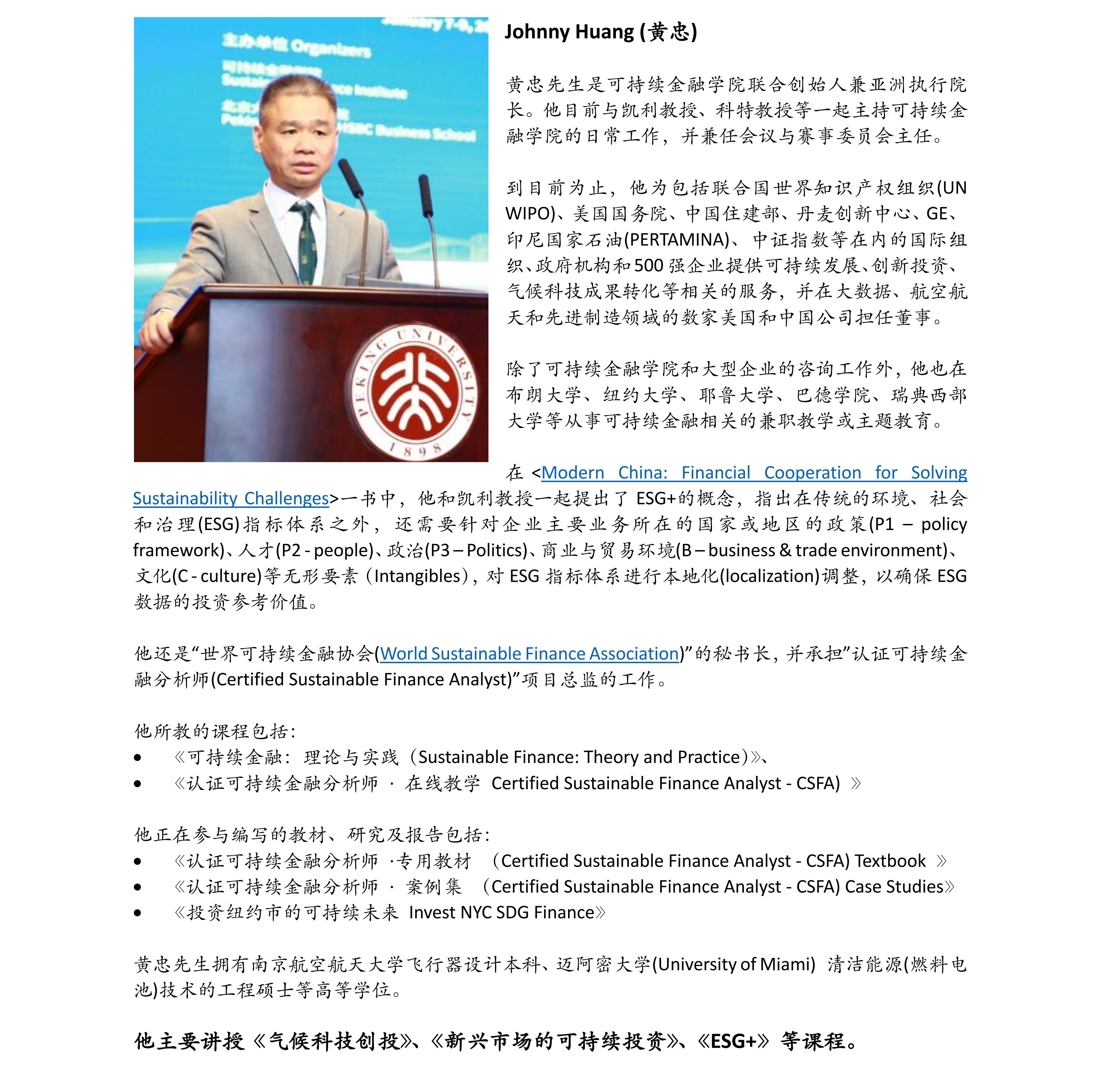 认证可持续金融分析师(CSFA)教员 - 黄忠院长 简介